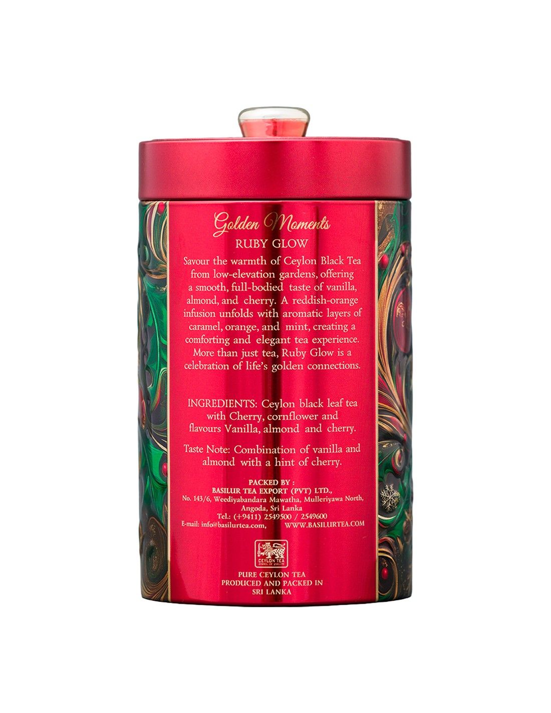 Ruby Glow te invita a saborear la calidez de un té con cuerpo completo y un perfil aterciopelado y dulce. El protagonista es un bouquet de cereza, matices de vainilla y almendra, complementado por la belleza del aciano (cornflower).